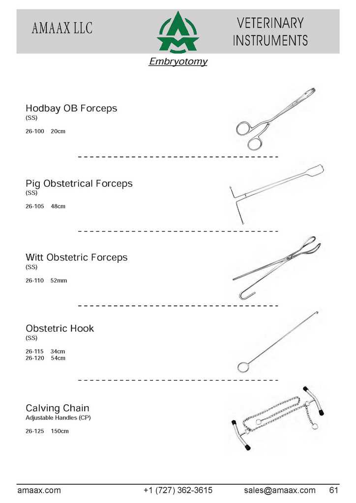 Embryotomy Hodbay OB Forceps (SS) 26-100 20cm Pig Obstetrical Forceps (SS) 26-105 48cm Witt Obstetric Forceps (SS) 26-110 52mm Obstetric Hook (SS) 26-115 34cm 26-120 54cm Calving Chain Adjustable Handles (CP) 26-125 150cm