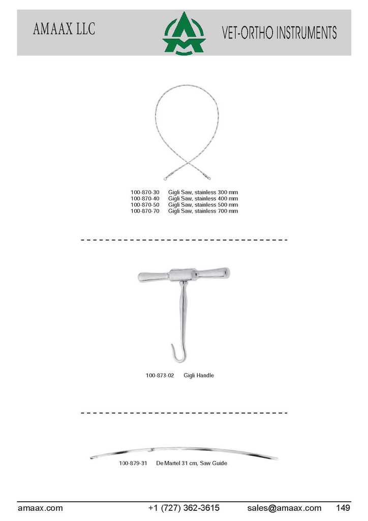 100-870-30 Gigli Saw, stainless 300 mm 100-870-40 Gigli Saw, stainless 400 mm 100-870-50 Gigli Saw, stainless 500 mm 100-870-70 Gigli Saw, stainless 700 mm 100-873-02 Gigli Handle 100-879-31 De Martel 31 cm, Saw Guide